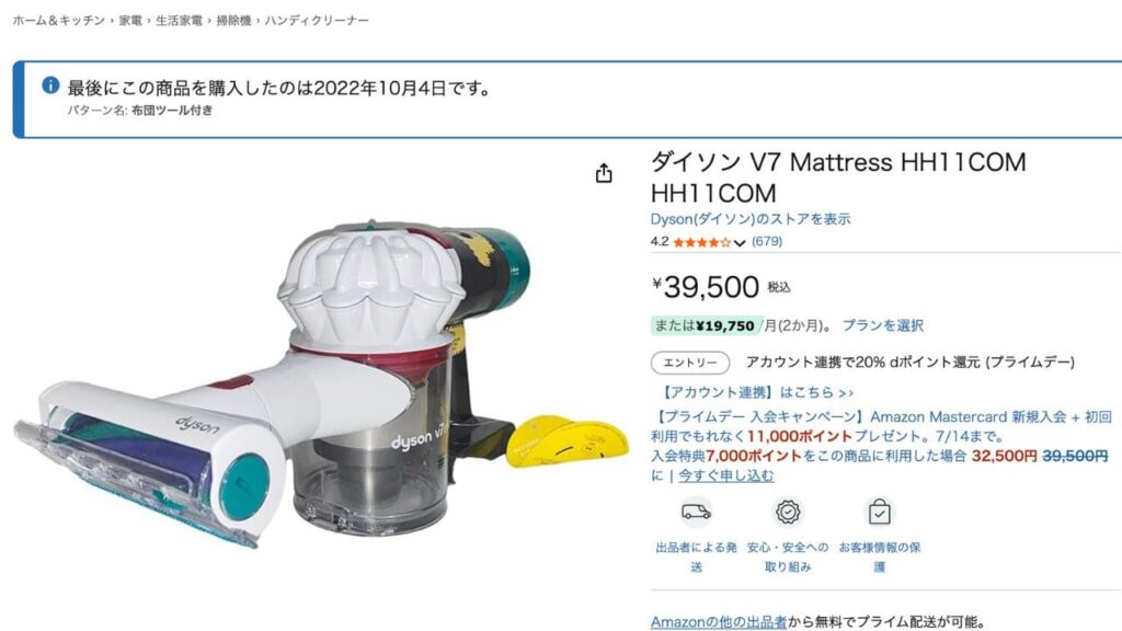 ちなみに私が使用していたのは「ダイソン V7 Mattress HH11COM HH11COM」というハンディータイプの掃除機です。